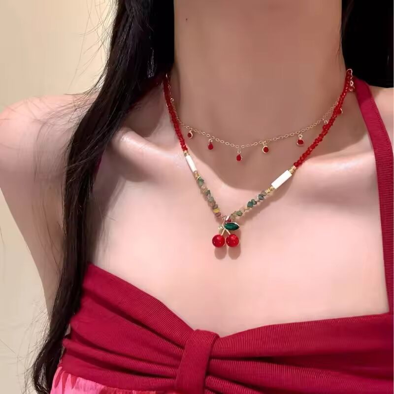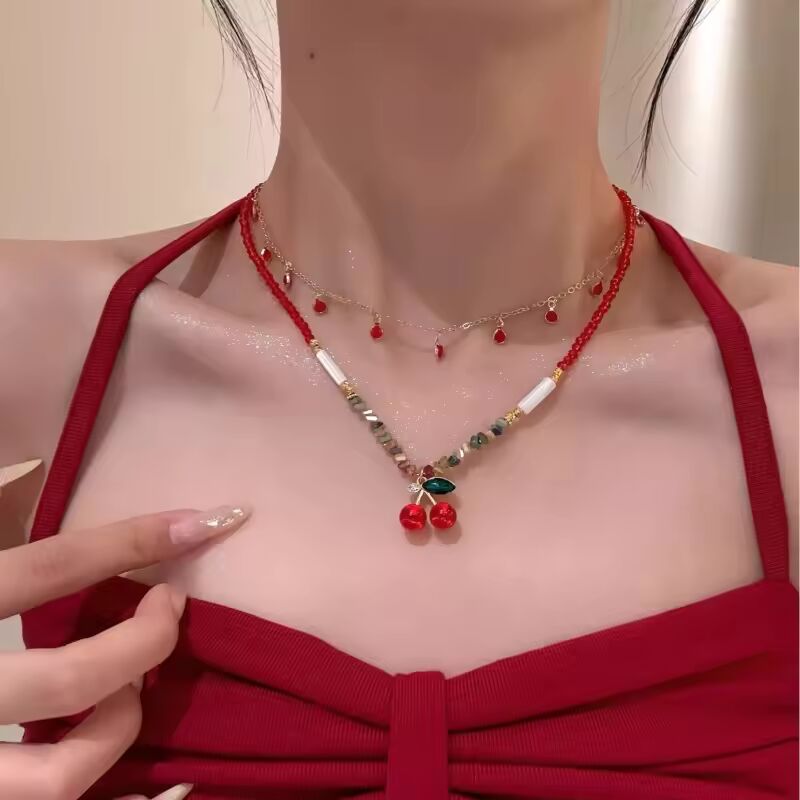 NEW Yhpup Red Enamel Fruit Cherry Pendant Necklace Stainless Steel Double-Layer Chain Stacking Fashion Trendy Sweet Jewelry